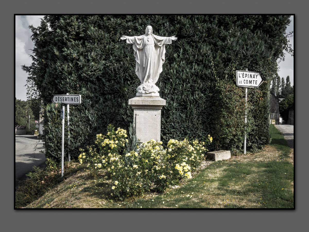 We live in an increasingly secular world. And France has a strong separation of church and state. And yet the French landscape — at least in my part of the Grand Ouest — is littered with Catholic iconography. This photography project centres around how these artefacts exist alongside, and sometimes in competition with, the mundane artefacts of life, such as street furniture and trees. It looks at the place of these superstitious objects in the rural and urban landscape.